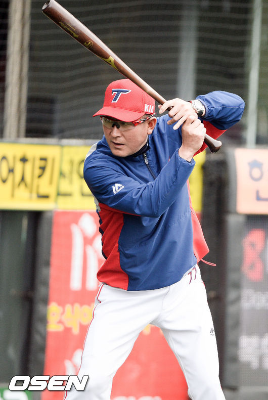8일 오후 서울 목동구장서 열린 '2015 타이어뱅크 KBO 리그' 넥센 히어로즈와 KIA 타이거즈의 경기에 앞서 KIA 김기태 감독이 강한울에게 타격자세를 선보이고 있다.