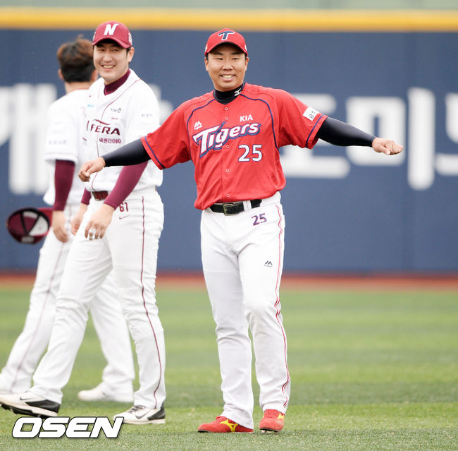 8일 오후 서울 목동구장서 열린 '2015 타이어뱅크 KBO 리그' 넥센 히어로즈와 KIA 타이거즈의 경기에 앞서 KIA 이범호가 스트레칭하고 있다.