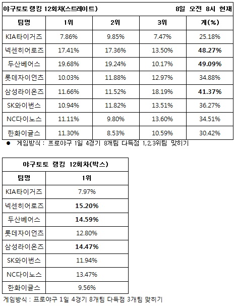 한편 순위에 상관없이 다득점 3개팀만을 맞히는 '박스' 게임에서도 넥센(15.20%)와 두산(14.59%), 삼성(14.47%)이 가장 많은 득점을 기록할 것으로 집계됐다.