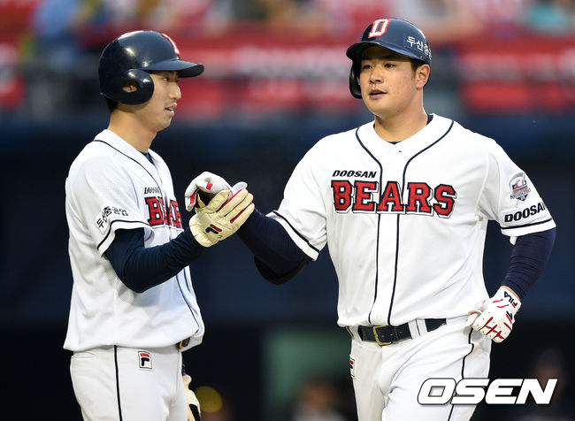 2회말 2사 1루에서 두산 김재환이 좌중월 투런홈런을 치고 홈에서 선행주자 성진호와 하이파이브를 하고 있다.