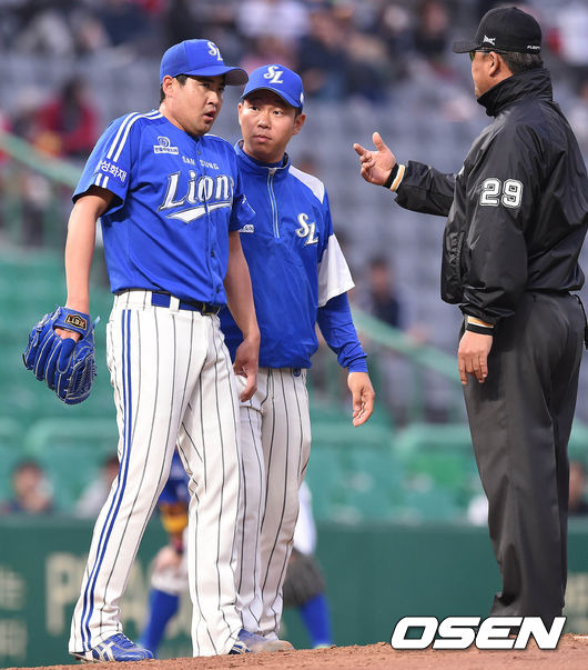 8일 오후 인천광역시 남구 인천SK행복드림구장에서 열린 '2015 타이어뱅크 KBO 리그' SK 와이번스와 삼성 라이온즈의 경기 2회말 2사 1,2루 박계현 타석, 장원삼이 투구중 몸에 이상을 느껴 숨을 고르고 있다.