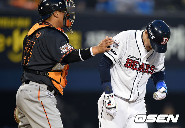 3회말 무사에서 두산 김재호가 몸에 맞는 볼로 출루하고 있다.