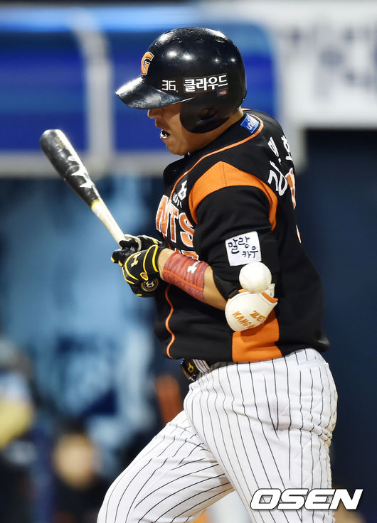 8일 오후 창원시 마산 야구장서 열린 '2015 타이어뱅크 KBO 리그' NC 다이노스와 롯데 자이언츠의 경기, 3회초 무사 주자 1루 롯데 강민호가 타석에서 NC 선발 찰리의 볼을 맞고 있다.