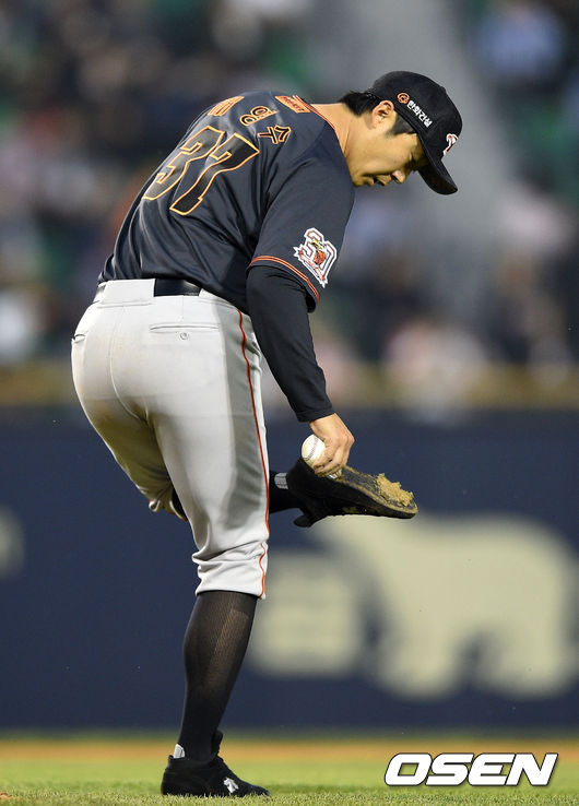 3회말 무사 1,2루 두산 최주환을 수비하는 과정에서 넘어진 한화 배영수가 스파이크를 정리하고 있다.