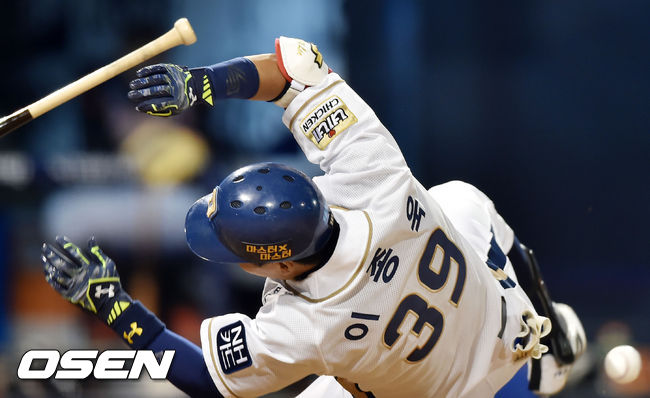 8일 오후 창원시 마산 야구장서 열린 '2015 타이어뱅크 KBO 리그' NC 다이노스와 롯데 자이언츠의 경기, 2사 주자 1루 NC 이종욱이 타석에서 롯데 선발 레일리의 볼을 팔꿈치에 맞고 넘어지고 있다.