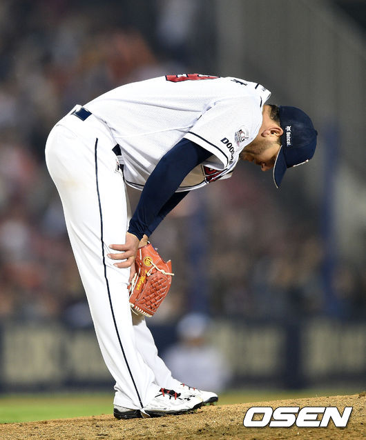 4회초 1사 1,2루에서 두산 마야가 한화 한상훈을 병살타로 처리하고 숨을 고르고 있다.