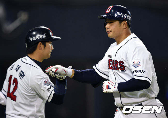 4회말 1사 1루에서 두산 김재환이 우월 투런 홈런을 치고 홈에서 최재훈과 하이파이브를 하고 있다.