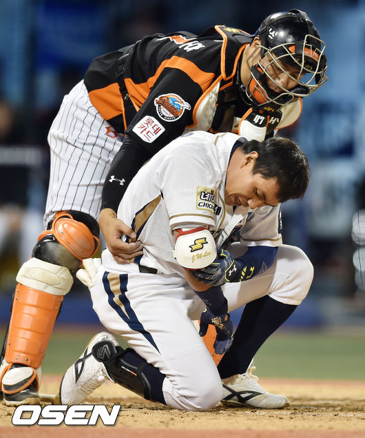 8일 오후 창원시 마산 야구장서 열린 '2015 타이어뱅크 KBO 리그' NC 다이노스와 롯데 자이언츠의 경기, 2사 주자 1루 NC 이종욱이 타석에서 롯데 선발 레일리의 볼을 팔꿈치에 맞고 고통을 호소할때 롯데 강민호가 부축하고 있다.