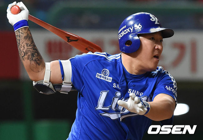8일 오후 인천광역시 남구 인천SK행복드림구장에서 열린 '2015 타이어뱅크 KBO 리그' SK 와이번스와 삼성 라이온즈의 경기 7회초 선두타자 최형우가 중전안타를 치고 있다.