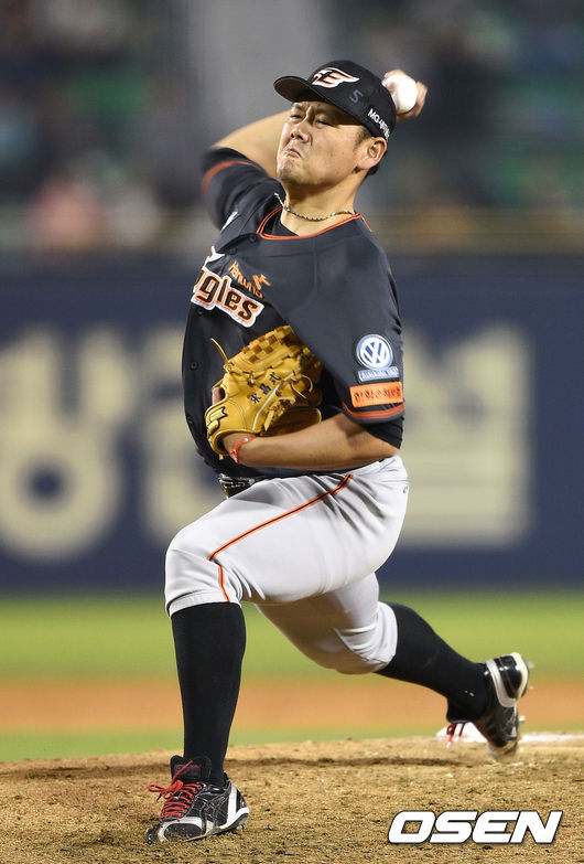 5회말 2사 만루에서 한화 송창식이 힘차게 공을 던지고 있다.