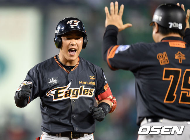 6회초 2사 만루에서 한화 정근우가 2타점 적시타를 날리고 환호하고 있다.