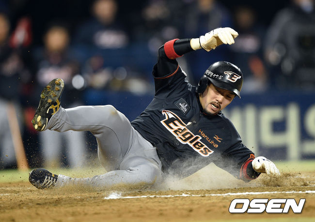 6회초 2사 만루에서 한화 정근우의 2타점 적시타때 2루주자 이용규가 득점을 올리고 있다.