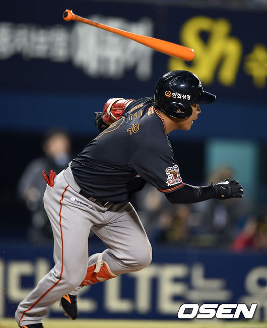 6회초 2사 만루에서 한화 정근우가 2타점 적시타를 날리고 있다.
