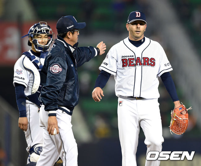 6회초 2사 1,2루에서 두산 마야가 마운드를 내려가고 있다.