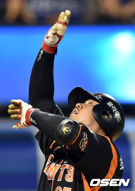 8일 오후 창원시 마산 야구장서 열린 '2015 타이어뱅크 KBO 리그' NC 다이노스와 롯데 자이언츠의 경기, 7회초 2사 롯데 최준석이 우월 솔로 홈런을 날린 후 홈에서 하늘에 계신 아버지께 세리머니를 하고 있다.