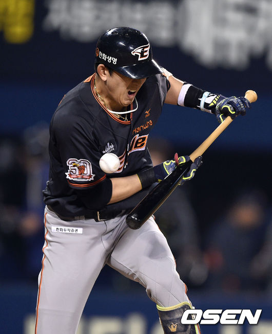 6회초 무사 1루에서 한화 김회성이 두산 마야의 투구를 맞고 있다.
