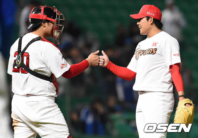 8일 오후 인천광역시 남구 인천SK행복드림구장에서 열린 '2015 타이어뱅크 KBO 리그' SK 와이번스와 삼성 라이온즈의 경기 종료 후 이재원과 문광은이 하이파이브를 하고 있다.