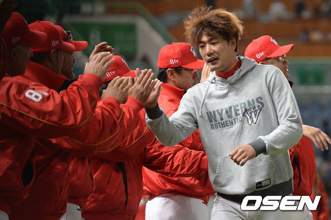 8일 오후 인천광역시 남구 인천SK행복드림구장에서 열린 '2015 타이어뱅크 KBO 리그' SK 와이번스와 삼성 라이온즈의 경기 종료 후 김광현이 동료들과 하이파이브를 하고 있다.