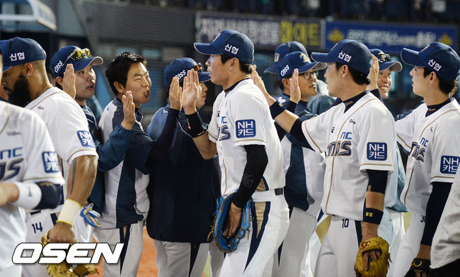 경기를 마치고 NC 김종호가 동료들과 함께 하이파이브를 하고 있다./ rumi@osen.co.kr