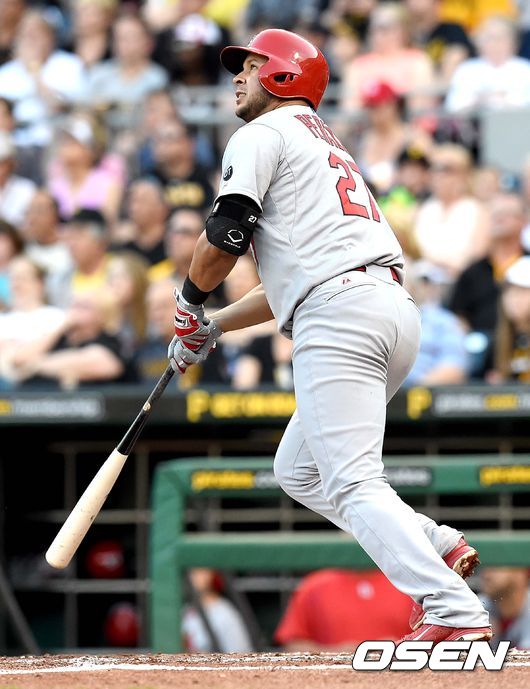 2회초 세인트루이스 공격 선두타자로 나선 자니 페랄타가 동점 중월 솔로포를 날리고 있다.