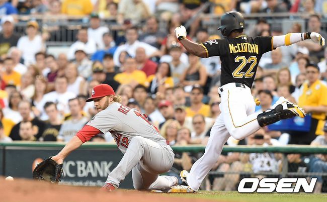 3회말 피츠버그 공격 2사 1루 상황 앤드류 매커친이 내야 안타를 날리고 1루에서 세이프 되고 있다.
