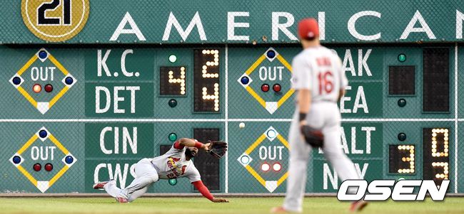 4회말 피츠버그 공격 선두타자로 나선 조시 해리슨의 타구를 세인트루이스 우익수 제이슨 헤이워드가 넘어지며 잡아내고 있다.