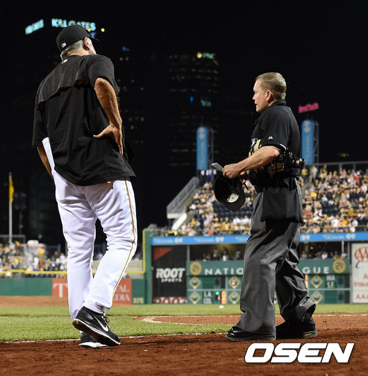8회말 2사에서 피츠버그 허들 감독이 강정호의 삼진 판정때 타임요청이 받아들여지지 않은 상황에 대해 어필하고 있다.