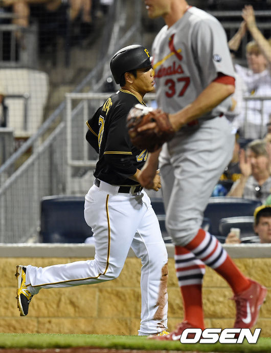 7회말 교체 멤버로 들어선 첫 타석서 강정호가 안타를 치고 진루, 1사후 워커의 안타때 홈을 밟고 있다.