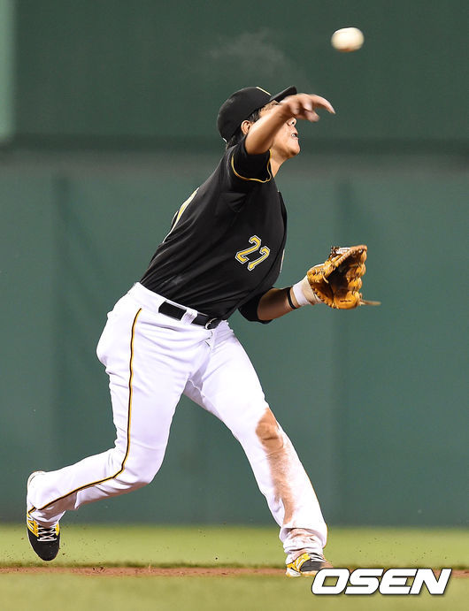 8회초 무사 1루에서 피츠버그 강정호가 세인트루이스 헤이워드를 직전타 아웃으로 처리하고 1루로 송구하고 있다.