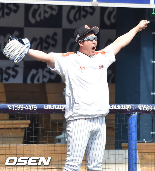 9일 오후 창원시 마산 야구장서 '2015 타이어뱅크 KBO 리그' NC 다이노스와 롯데 자이언츠의 경기가 열릴 예정인 가운데 양팀 훈련시간에 롯데 황재균이 기지개를 켜고 있다.