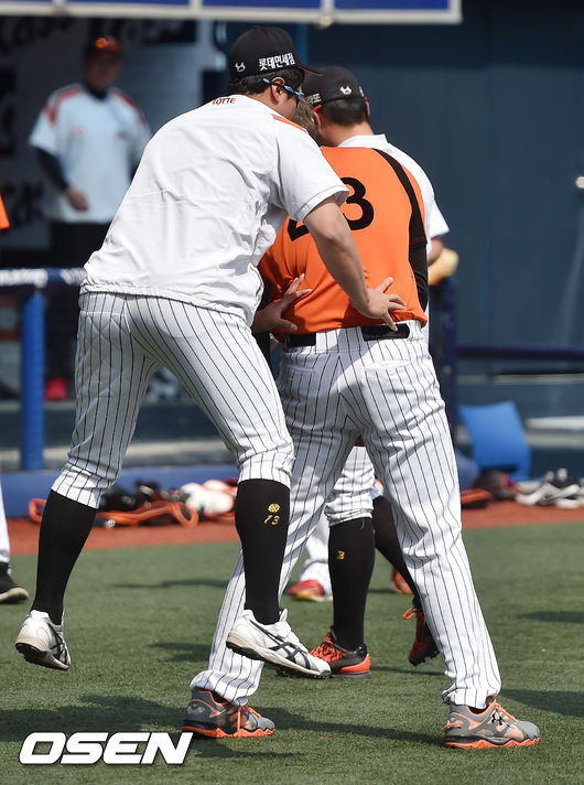 9일 오후 창원시 마산 야구장서 '2015 타이어뱅크 KBO 리그' NC 다이노스와 롯데 자이언츠의 경기가 열릴 예정인 가운데 양팀 훈련시간에 롯데 황재균이 롯데 린드블럼 등 뒤에서 장난을 치고 있다.
