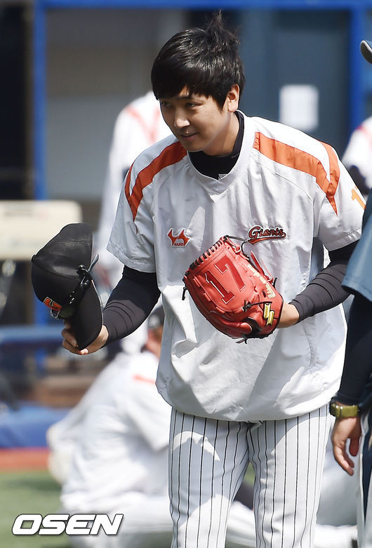 9일 오후 창원시 마산 야구장서 '2015 타이어뱅크 KBO 리그' NC 다이노스와 롯데 자이언츠의 경기가 열릴 예정인 가운데 양팀 훈련시간에 롯데 심수창이 NC 덕아웃 쪽으로 인사를 하고 있다.