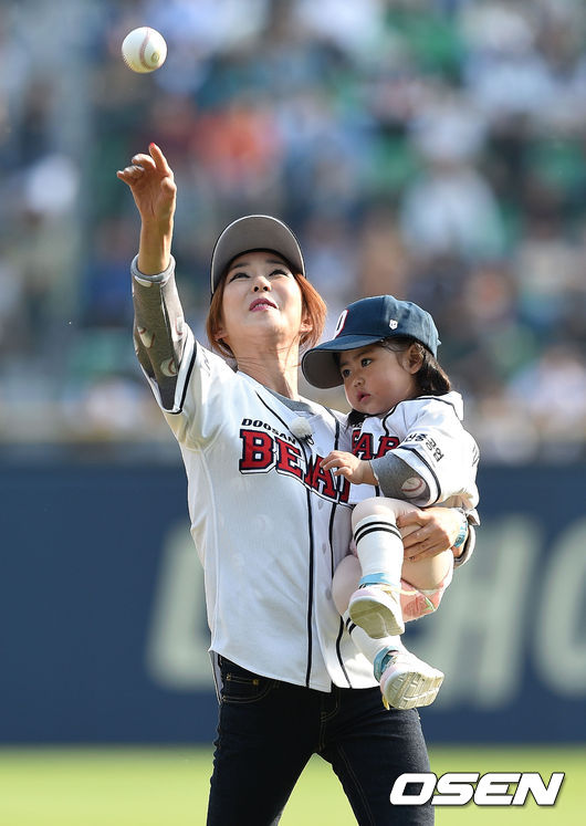 경기에 앞서 가수 슈가 딸 라율 양을 안고 시구를 하고 있다.
