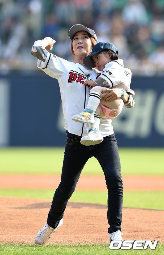 경기에 앞서 가수 슈가 딸 라율 양을 안고 시구를 하고 있다.