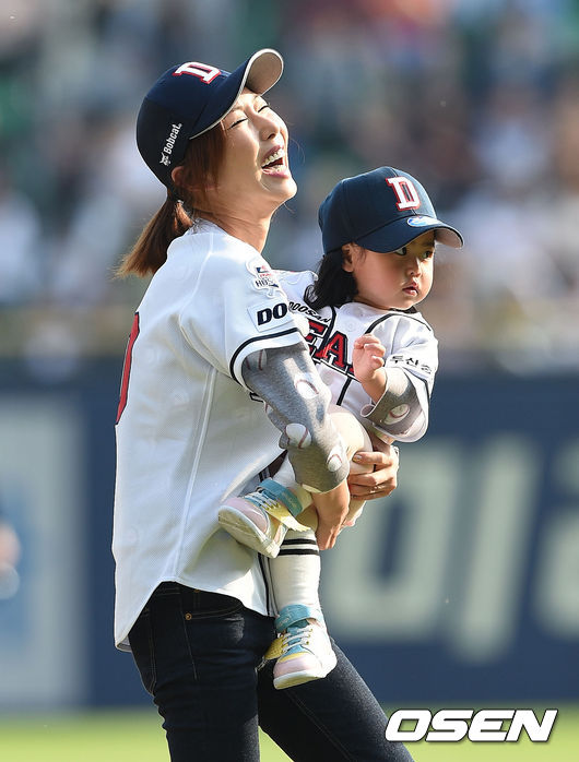 경기에 앞서 가수 슈가 딸 라율 양을 안고 시구를 하고 있다.