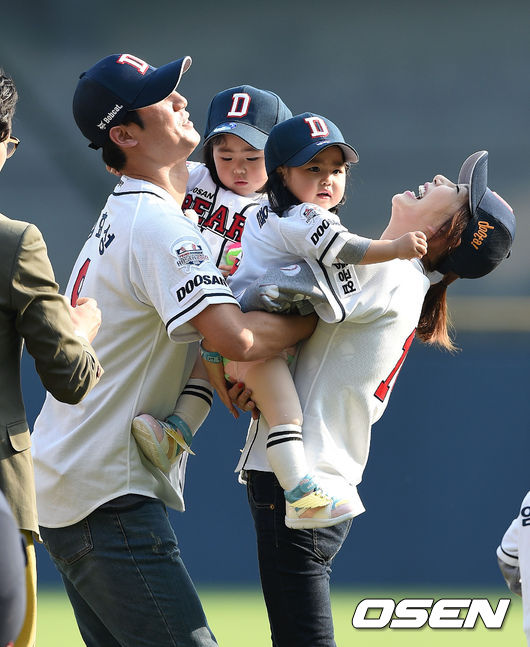 경기에 앞서 가수 슈와 남편 임효성이 시구를 위해 쌍둥이 딸을 안고 있다.