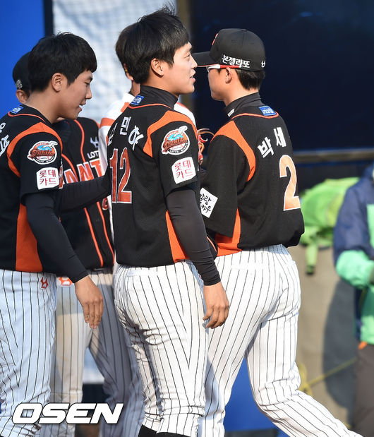 9일 오후 창원시 마산 야구장서 열린 '2015 타이어뱅크 KBO 리그' NC 다이노스와 롯데 자이언츠의 경기, 롯데 선발 박세웅이 1회를 마친 후 덕아웃에서 동료들과 하이파이브를 하고 있다.
