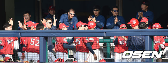 9일 오후 서울 목동구장에서 열린 '2015 타이어뱅크 KBO리그' 넥센 히어로즈와 KIA 타이거즈의 경기, 1회초 2사 1,2루 KIA 쓰리런을 날린 김원섭이 덕아웃에서 동료들과 하이파이브를 나누고 있다.