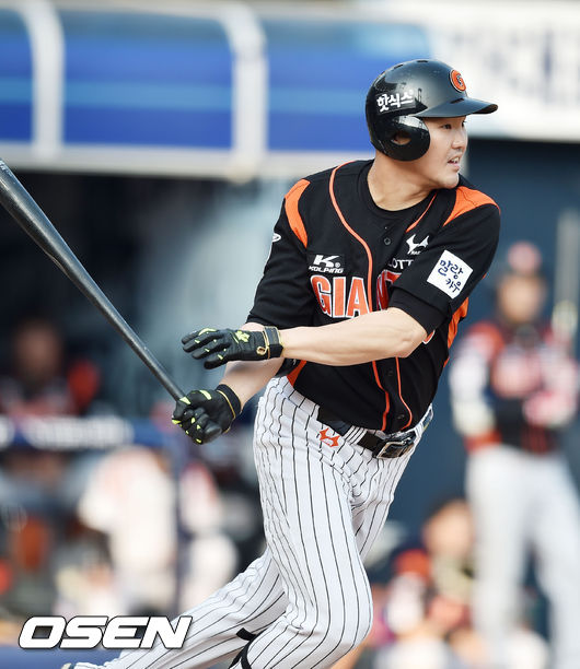 9일 오후 창원시 마산 야구장서 열린 '2015 타이어뱅크 KBO 리그' NC 다이노스와 롯데 자이언츠의 경기, 2회초 1사 롯데 박종윤이 우익수 플라이 타구를 날리고 있다. 박종윤 이번시즌 개막전에 부상입고 오늘 처음으로 1군에 복귀했다.