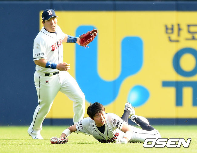 1회초 무사에서 두산 정수빈이 한화 이용규의 타구를 잡으려 몸을 날렸지만 놓치고 있다.