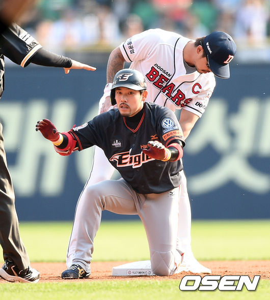 1회초 무사에서 한화 이용규가 좌중간을 가르는 2루타를 치고 타임을 외치고 있다.