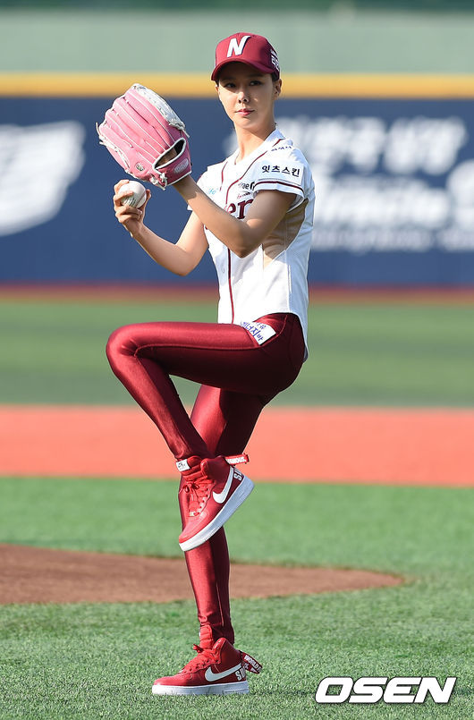 9일 오후 서울 목동구장에서 열린 '2015 타이어뱅크 KBO리그' 넥센 히어로즈와 KIA 타이거즈의 경기에 앞서 모델 이연이 시구를 하고 있다.