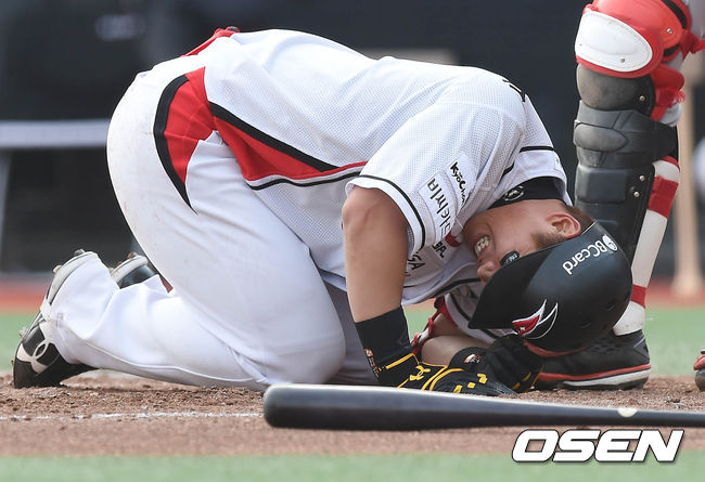 9일 오후 경기도 수원시 수원kt위즈파크에서 열린 '2015 타이어뱅크 KBO 리그' kt 위즈와 LG 트윈스의 경기 2회말 1사 박경수가 류제국의 투구에 몸을 맞고 고통스러워하고 있다.