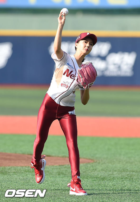 9일 오후 서울 목동구장에서 열린 '2015 타이어뱅크 KBO리그' 넥센 히어로즈와 KIA 타이거즈의 경기에 앞서 모델 이연이 시구를 하고 있다.