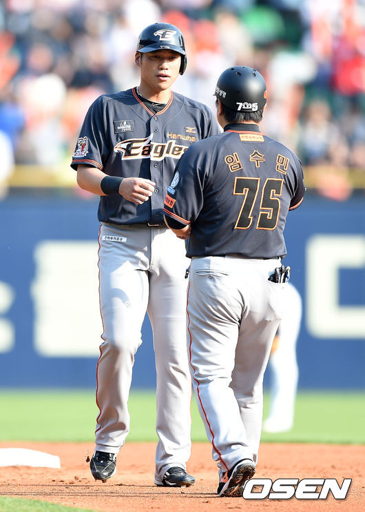 1회초 1사 1,2루에서 한화 최진행이 중전 적시타를 치고 임수민 코치와 하이파이브를 하고 있다.