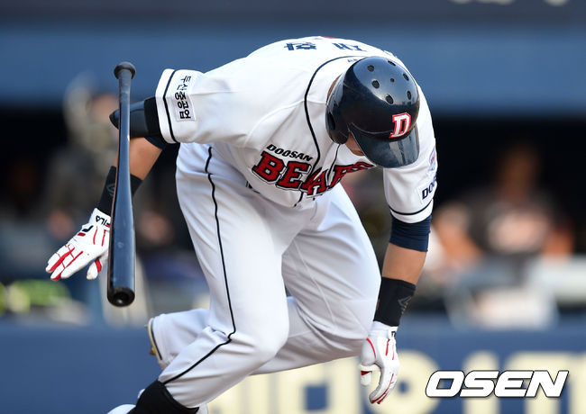 3회말 무사에서 두산 김재환이 헛스윙을 하며 중심을 잃고 넘어지고 있다.