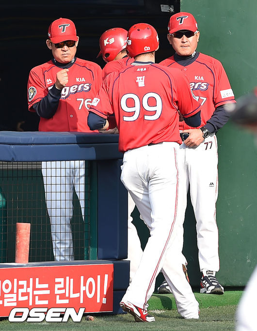 9일 오후 서울 목동구장에서 열린 '2015 타이어뱅크 KBO리그' 넥센 히어로즈와 KIA 타이거즈의 경기, 1회초 2사 1,2루 KIA 김원섭이 쓰리런때 홈을 밟은 필과 김기태 감독이 인사를 나누고 있다.