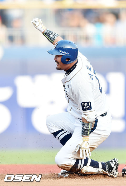 9일 오후 창원시 마산 야구장서 열린 '2015 타이어뱅크 KBO 리그' NC 다이노스와 롯데 자이언츠의 경기, 3회말 1사 주자 2,3루 NC 이호준이 2타점 적시타를 날린 후 2루에서 기뻐하고 있다.