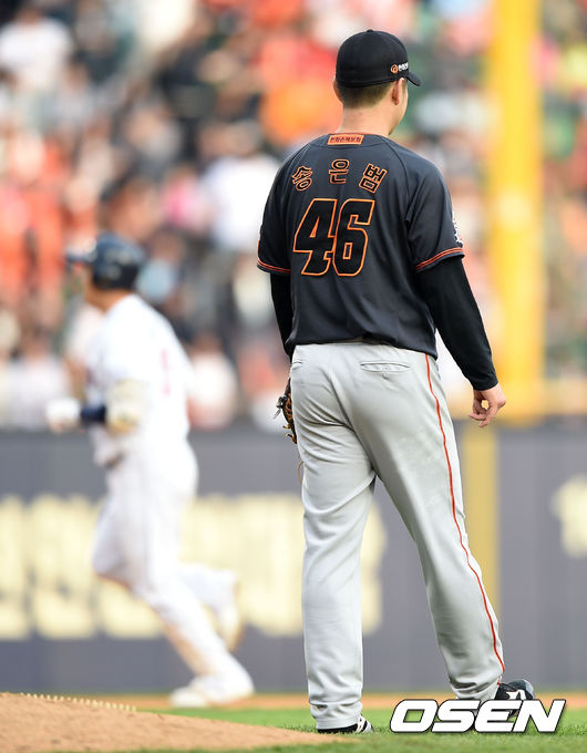 5회말 1사에서 두산 양의지에게 좌월 솔로 홈런을 허용한 한화 송은범이 아쉬운 표정을 짓고 있다.