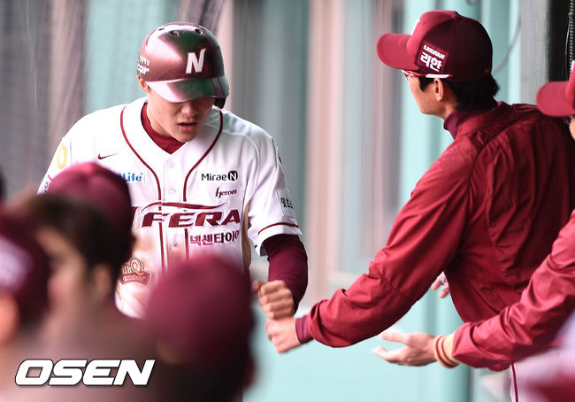 9일 오후 서울 목동구장에서 열린 '2015 타이어뱅크 KBO리그' 넥센 히어로즈와 KIA 타이거즈의 경기,4회말 무사 2루 넥센 박동원의 적시타로 홈을 밟은 넥센 김하성이 덕아웃에서 염경엽 감독과 기쁨의 주먹맞대기를 하고 있다.